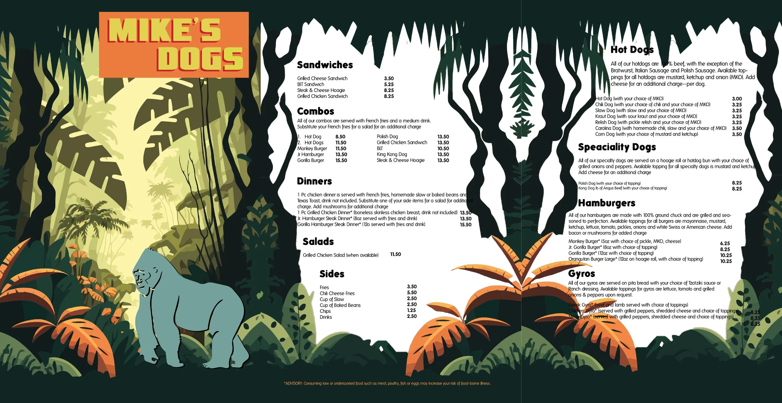 The menu was made in Adobe Illustrator with a style that was influenced by King Kong stories and wild adventures. The established color palette, big fonts, and themed images all work together to make a menu that is both useful and on-brand, drawing customers into the restaurant's story.